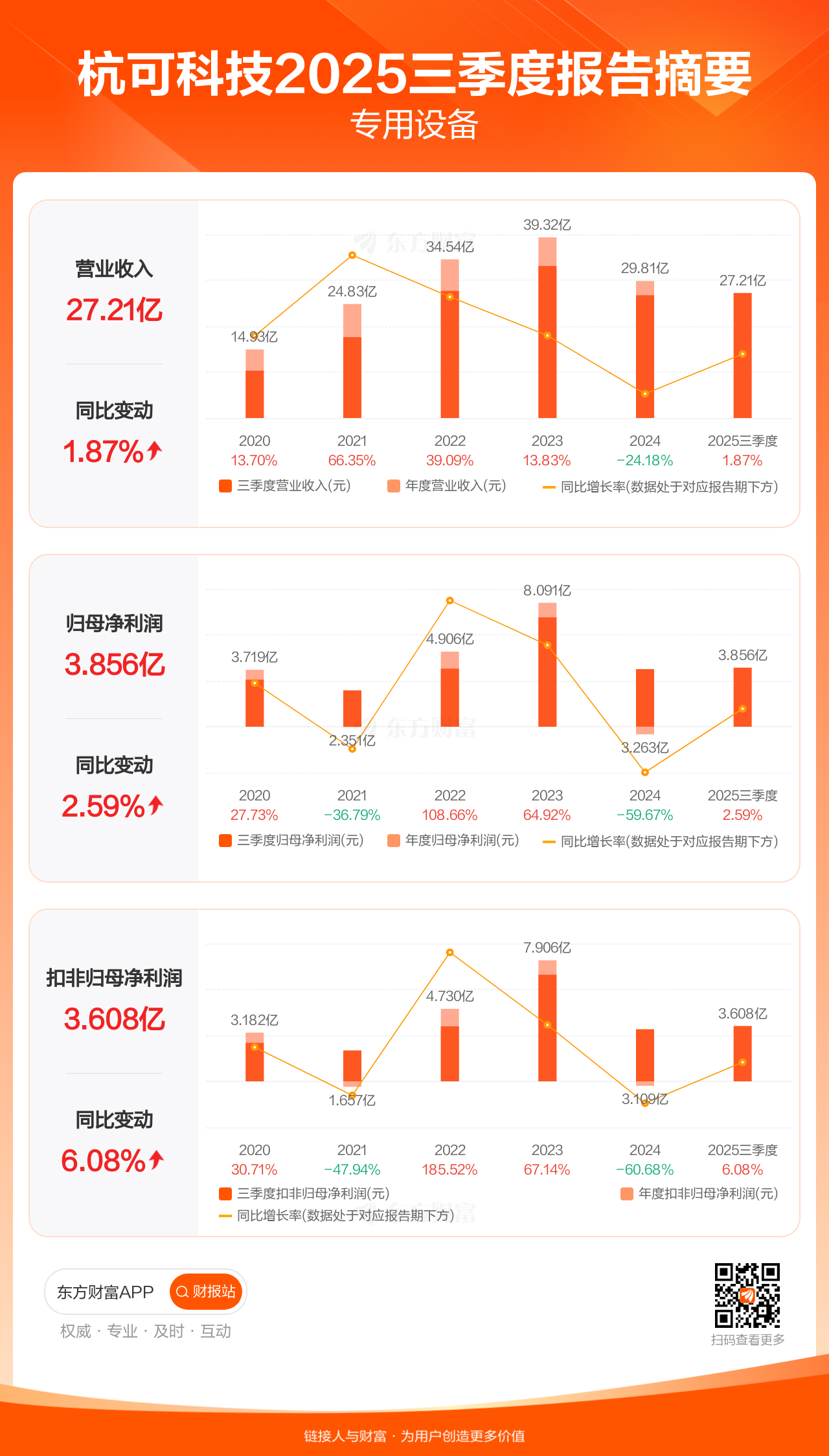 杭可科技10月28日发布2025年三季报显示,公司前三季实现营业收入27.21亿元,同比增长1.87%;归母净利润3.86亿元,同比增长2.59%;扣非归母净利润3.61亿元,同比增长6.08%。