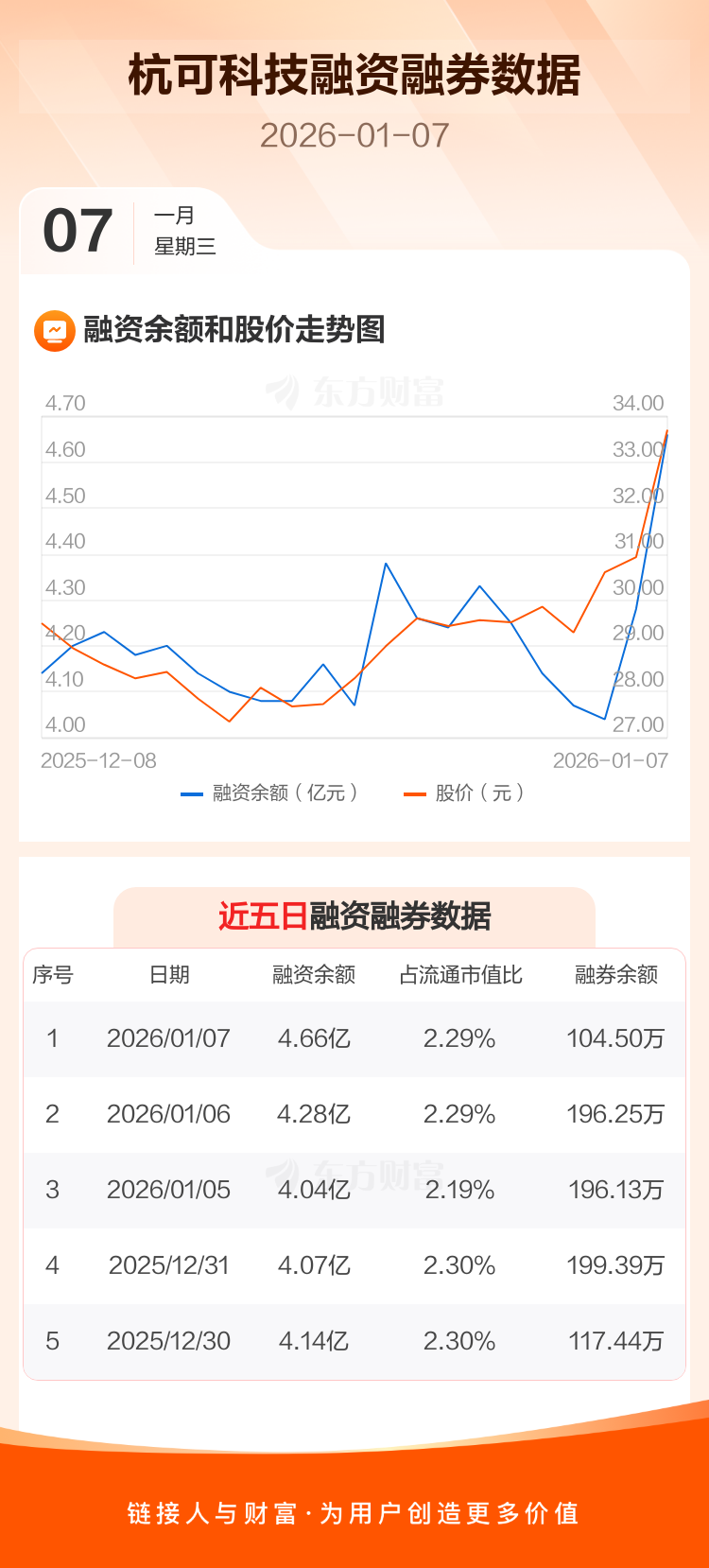交易所最新数据显示,杭可科技于2026年1月7日获融资买入1.34亿元,融资偿还9524.44万元,当日融资净买入3835.38万元。目前,该股融资余额4.66亿,占流通市值比例为2.29%。