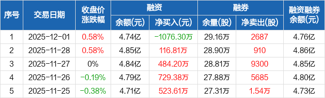 中国通号:融资净偿还1076.3万元,融资余额4.74亿元(12-01)