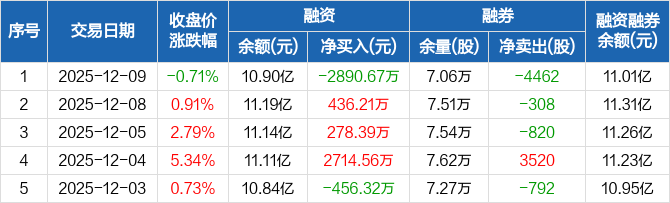 绿的谐波:融资净偿还2890.67万元,融资余额10.9亿元(12-09)