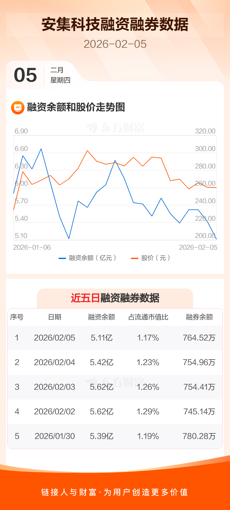 交易所最新数据显示,安集科技于2026年2月5日获融资买入2949.84万元,融资偿还5995.18万元,当日融资净偿还3045.34万元。目前,该股融资余额5.11亿,占流通市值比例为1.17%。