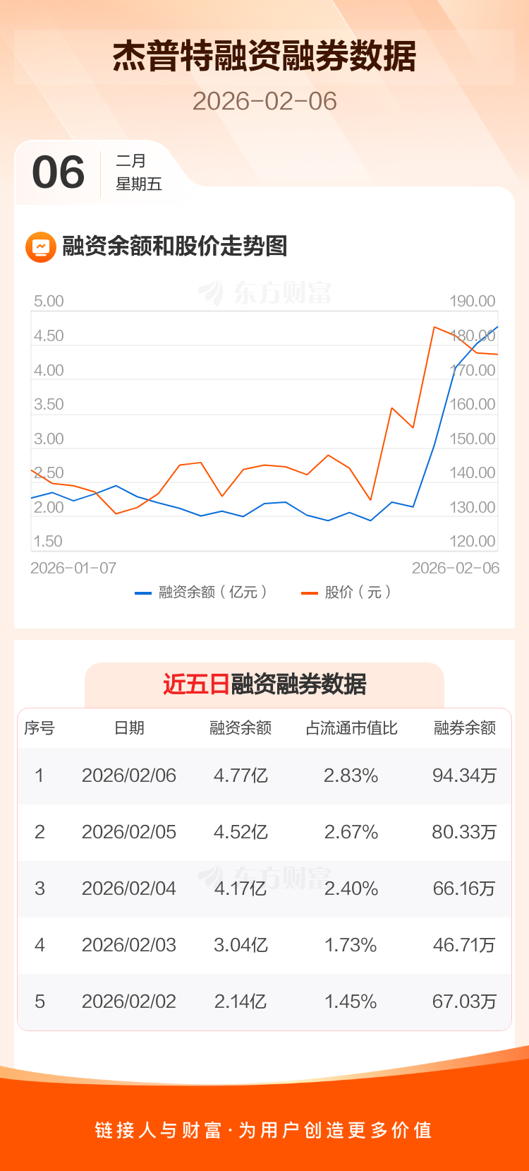 交易所最新数据显示,杰普特于2026年2月6日获融资买入1.57亿元,融资偿还1.32亿元,当日融资净买入2496.7万元。目前,该股融资余额4.77亿,占流通市值比例为2.83%。