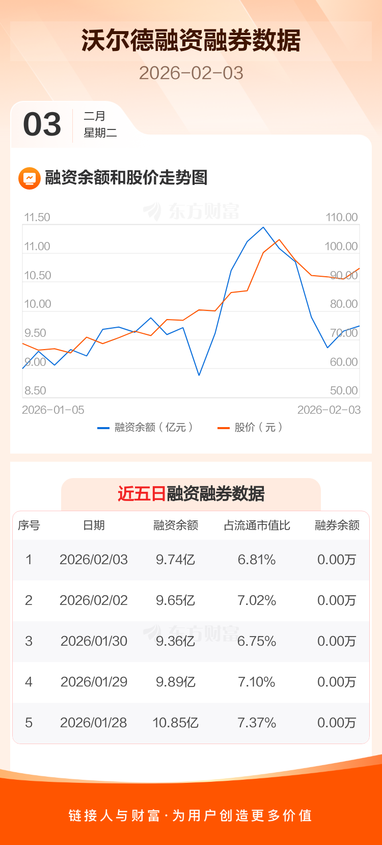 交易所最新数据显示,沃尔德于2026年2月3日获融资买入1.01亿元,融资偿还9131.28万元,当日融资净买入921.6万元。目前,该股融资余额9.74亿,占流通市值比例为6.81%。