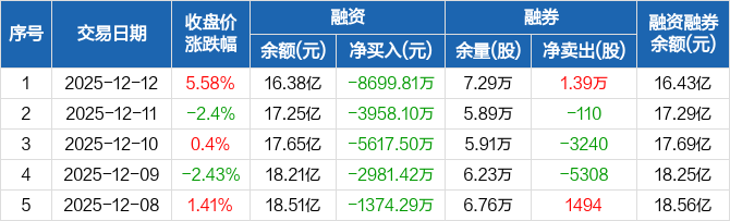 融资方面,当日融资买入1.24亿元,融资偿还2.11亿元,融资净偿还8699.81万元,连续5日净偿还累计2.26亿元。融券方面,融券卖出1.69万股,融券偿还3000股,融券余量7.29万股,融券余额503.01万元。融资融券余额合计16.43亿元。