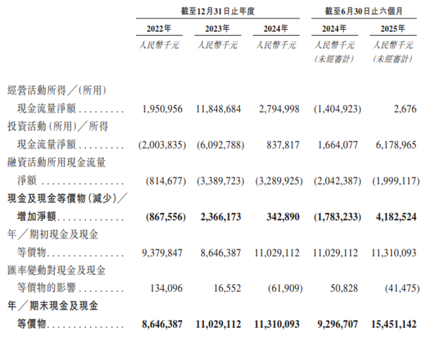 据公司招股书,2022至2024年及2025年上半年,公司经营活动现金流净额分别为19.5亿元、118.5亿元、27.9亿元,267.6万元,呈现剧烈波动的情况。2025年前三季度,公司经营活动现金流净额回升至32.85亿元,主要得益于期内原材料采购付款同比减少。