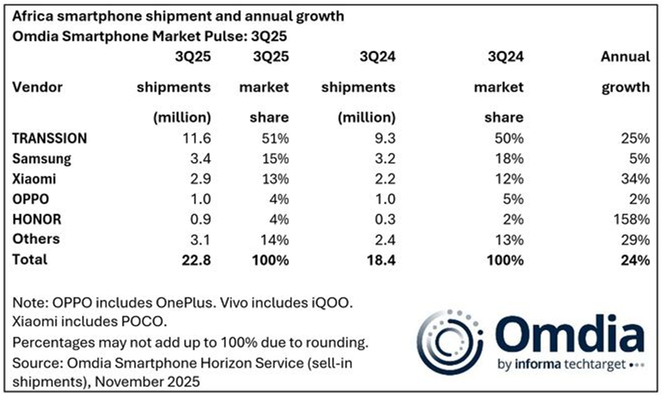 第三方市场调查机构Omdia最新研究显示,2025年第三季度,非洲智能手机出货量同比激增24%,达到2280万台。具体来看,2025年第三季度非洲智能手机出货量排在第一位的仍是传音,以51%的市场份额遥遥领先,同比增长了25%,但同期小米和荣耀的增长率为34%和158%,大有后来居上的态势。