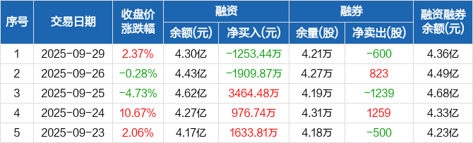 芯源微:融资净偿还1253.44万元,融资余额4.3亿元(09-29)