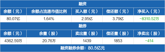 融资方面,当日融资买入2.95亿元,融资偿还3.79亿元,融资净偿还8310.52万元。融券方面,融券卖出1439股,融券偿还1853股,融券余量20.76万股,融券余额4362.59万元。融资融券余额合计80.5亿元。