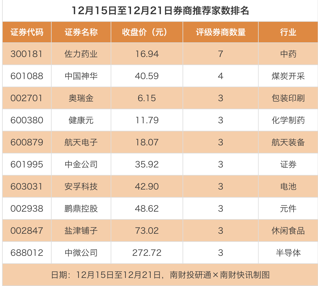 从券商推荐家数来看,12月15日至12月21日有187家上市公司得到券商推荐,其中佐力药业获得7家推荐,中国神华获得4家推荐,奥瑞金等获得3家推荐。