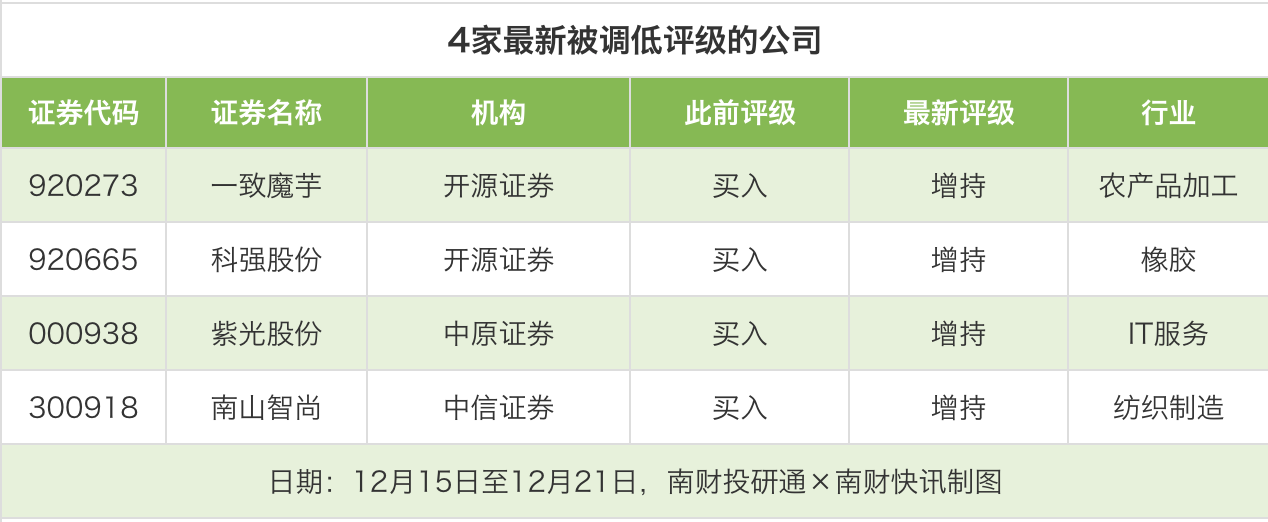 评级调低方面,12月15日至12月21日,券商调低上市公司评级达到4家次,最新数据包括了开源证券对一致魔芋的评级从“买入”调低至“增持”,开源证券对科强股份的评级从“买入”调低至“增持”,中原证券对紫光股份的评级从“买入”调低至“增持”。