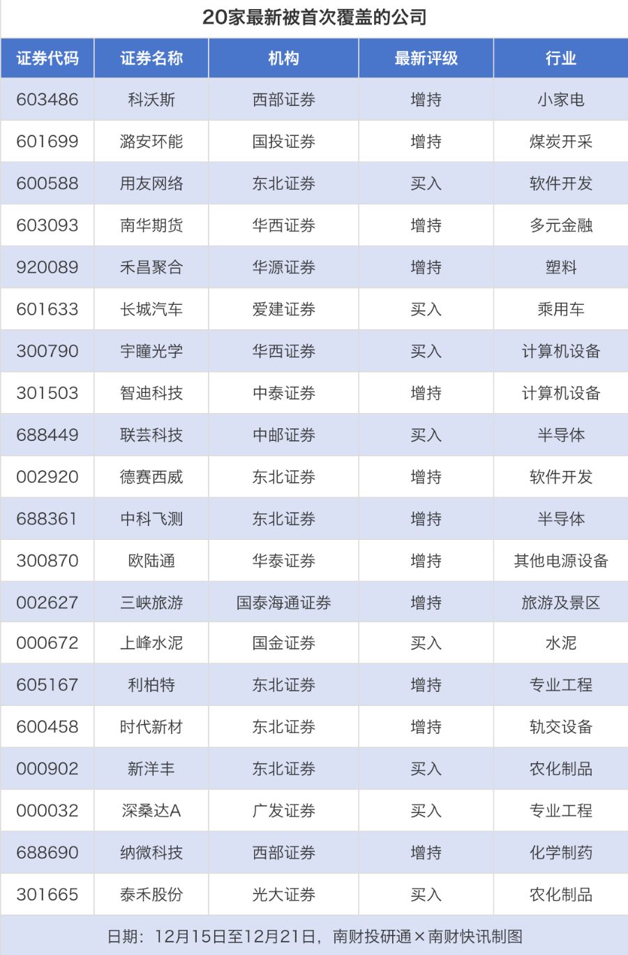 首次覆盖方面,12月15日至12月21日券商共给出了75次首次覆盖,其中科沃斯获得西部证券给予“增持”评级,潞安环能获得国投证券给予“增持”评级,用友网络获得东北证券给予“买入”评级,南华期货获得华西证券给予“增持”评级,禾昌聚合获得华源证券给予“增持”评级。