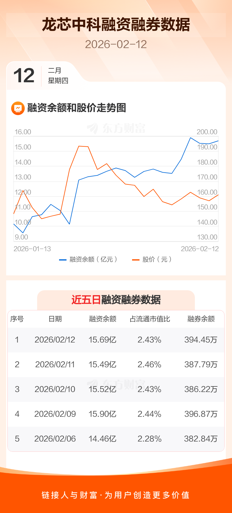 交易所最新数据显示,龙芯中科于2026年2月12日获融资买入1.53亿元,融资偿还1.33亿元,当日融资净买入1939.82万元。目前,该股融资余额15.69亿,占流通市值比例为2.43%。