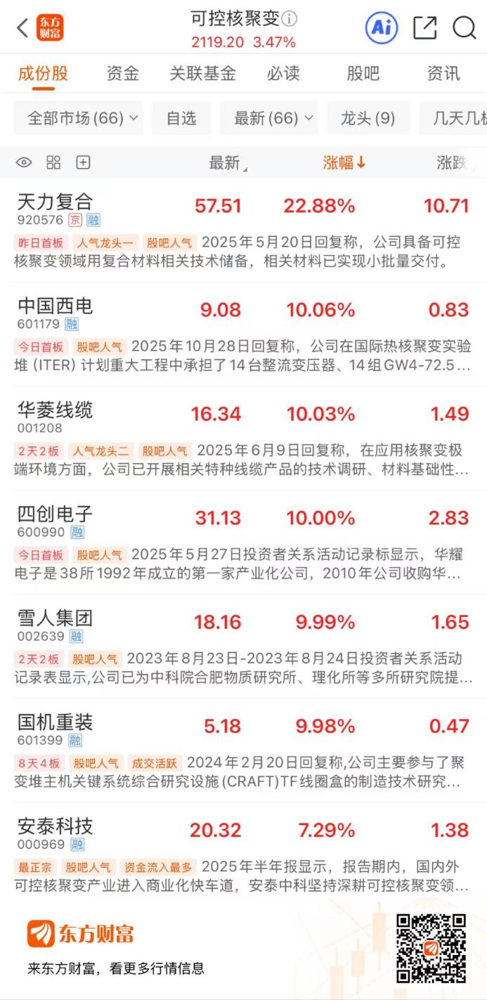 掀涨停潮!可控核聚变集体走强 龙头6天翻倍