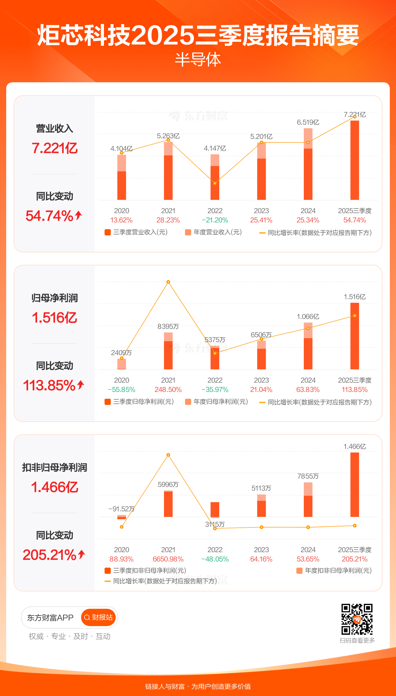 炬芯科技10月29日发布2025年三季报显示,公司前三季实现营业收入7.22亿元,同比增长54.74%;归母净利润1.52亿元,同比增长113.85%;扣非归母净利润1.47亿元,同比增长205.21%。