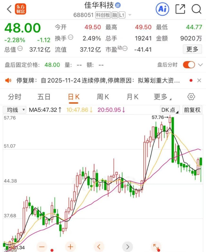 截至11月21日收盘,佳华科技下跌2.28%,报收于48元/股,最新市值为37.12亿元。