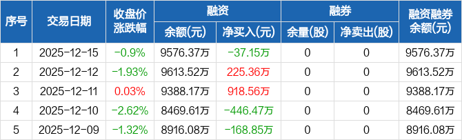 莱伯泰科:融资净偿还37.15万元,融资余额9576.37万元(12-15)