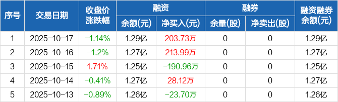 金达莱:融资净买入203.73万元,融资余额1.29亿元(10-17)