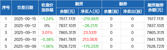 宝兰德:融资净偿还219.99万元,融资余额7617.11万元(09-15)