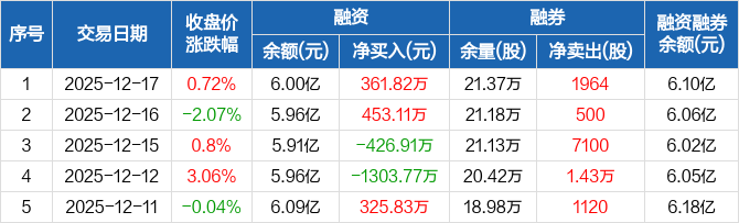 融资方面,当日融资买入1853.61万元,融资偿还1491.79万元,融资净买入361.82万元。融券方面,融券卖出2629股,融券偿还665股,融券余量21.37万股,融券余额1009.66万元。融资融券余额合计6.1亿元。