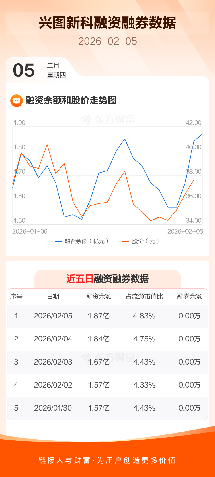 交易所最新数据显示,兴图新科于2026年2月5日获融资买入1167.92万元,融资偿还859.62万元,当日融资净买入308.3万元。目前,该股融资余额1.87亿,占流通市值比例为4.83%。