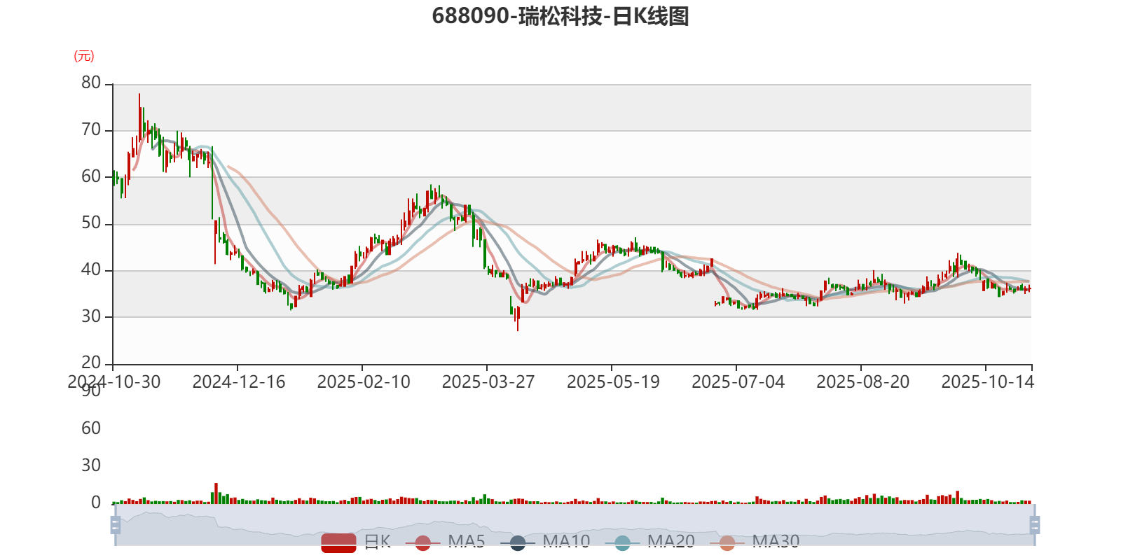 中证智能财讯瑞松科技(688090)10月30日披露2025年第三季度报告。前三季度公司实现营业总收入5.82亿元,同比下降12.07%;归母净利润亏损613.26万元,上年同期盈利425.78万元;扣非净利润亏损887.75万元,上年同期亏损195.81万元;经营活动产生的现金流量净额为4974.24万元,上年同期为-1588.81万元;报告期内,瑞松科技基本每股收益为-0.05元,加权平均净资产收益率为-0.68%。