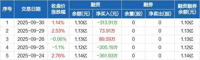 三达膜:融资净偿还313.91万元,融资余额1.1亿元(09-30)