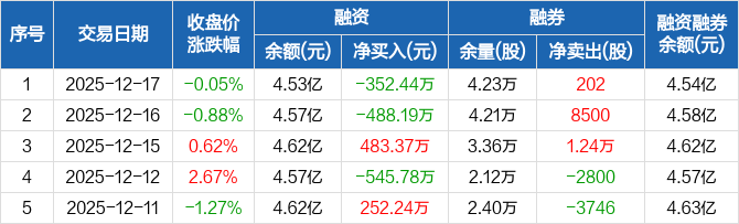 金宏气体:融资净偿还352.44万元,融资余额4.53亿元(12-17)