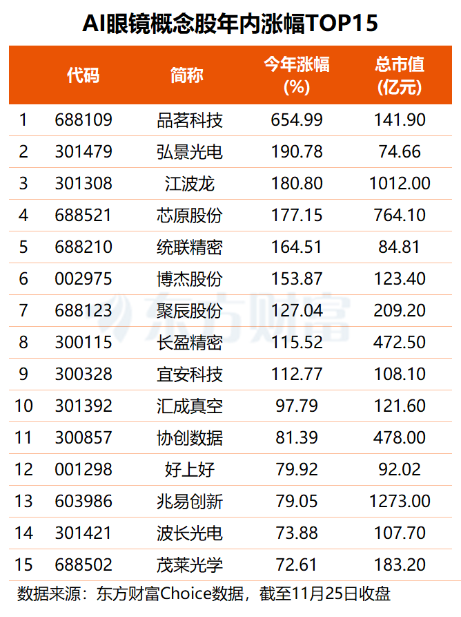 超七成AI眼镜概念股年内股价实现上涨,平均涨幅约32.14%。其中,品茗科技累涨655%居首,弘景光电、江波龙、芯原股份、统联精密、长盈精密等8股年内股价亦大涨,涨幅均在一倍至两倍之间。