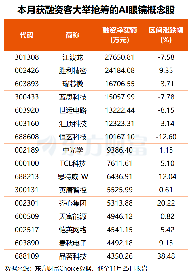东方财富Choice数据显示,11月以来,共有33只AI眼镜概念股获杠杆资金加仓。其中,12股融资净买额超5000万元,江波龙、胜利精密分别获融资客抢筹2.77亿和2.42亿元,瑞芯微、蓝思科技、世运电路、汇顶科技、恒玄科技均获杠杆资金逾1亿元加仓,中光学、TCL科技、思特威-W等榜上有名。