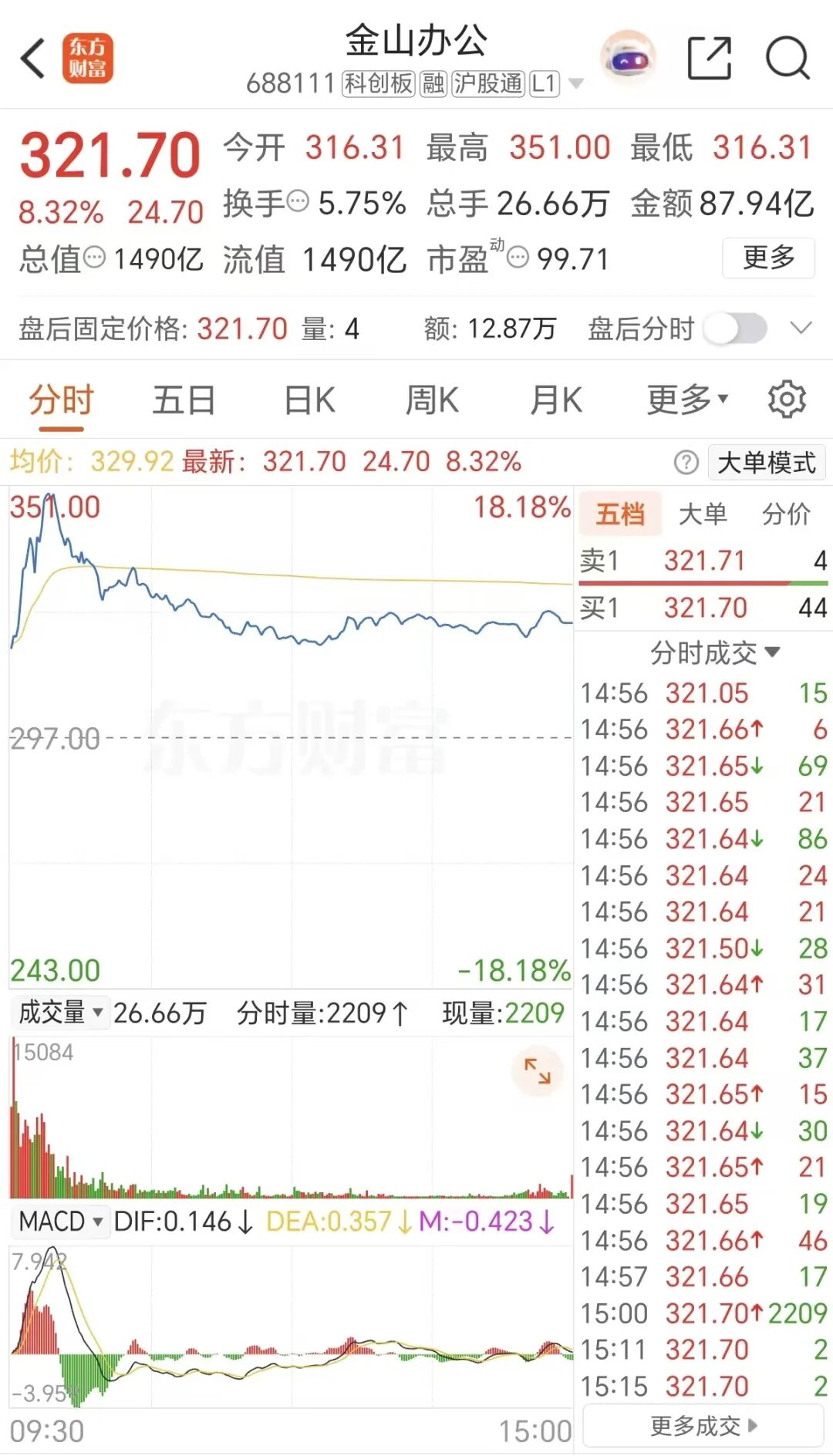 周一盘初千亿市值巨头金山办公一度猛烈拉升超18%,收盘回落但仍涨超8%,成交金额超87亿元。