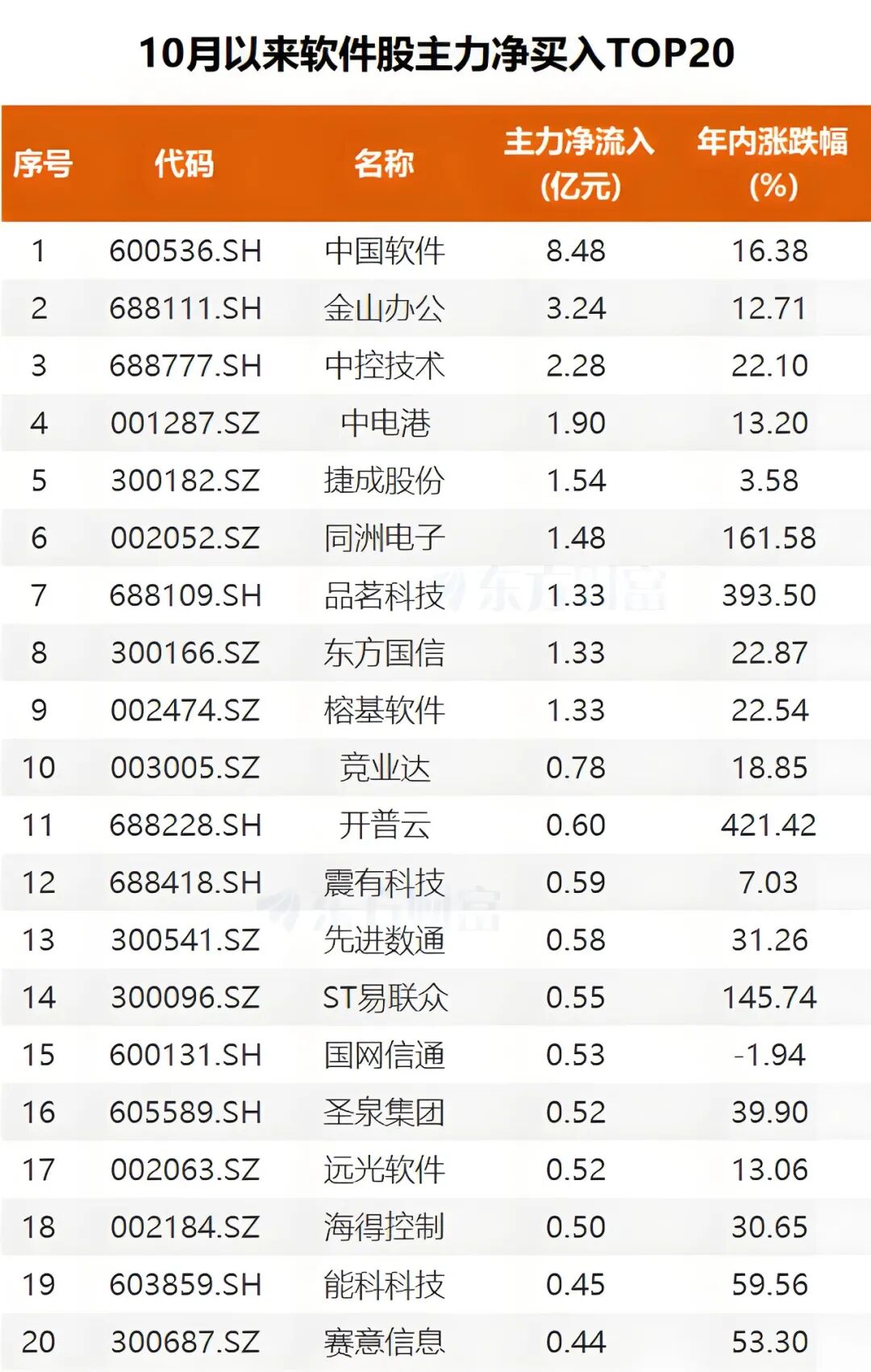 具体来看,中国软件主力净买入超8亿元,今年以来涨幅16%;金山办公主力净买入超3亿元,今年以来涨幅近13%。