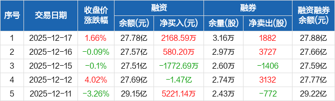 融资方面,当日融资买入1.98亿元,融资偿还1.76亿元,融资净买入2168.59万元。融券方面,融券卖出3376股,融券偿还1494股,融券余量3.16万股,融券余额986.87万元。融资融券余额合计27.88亿元。