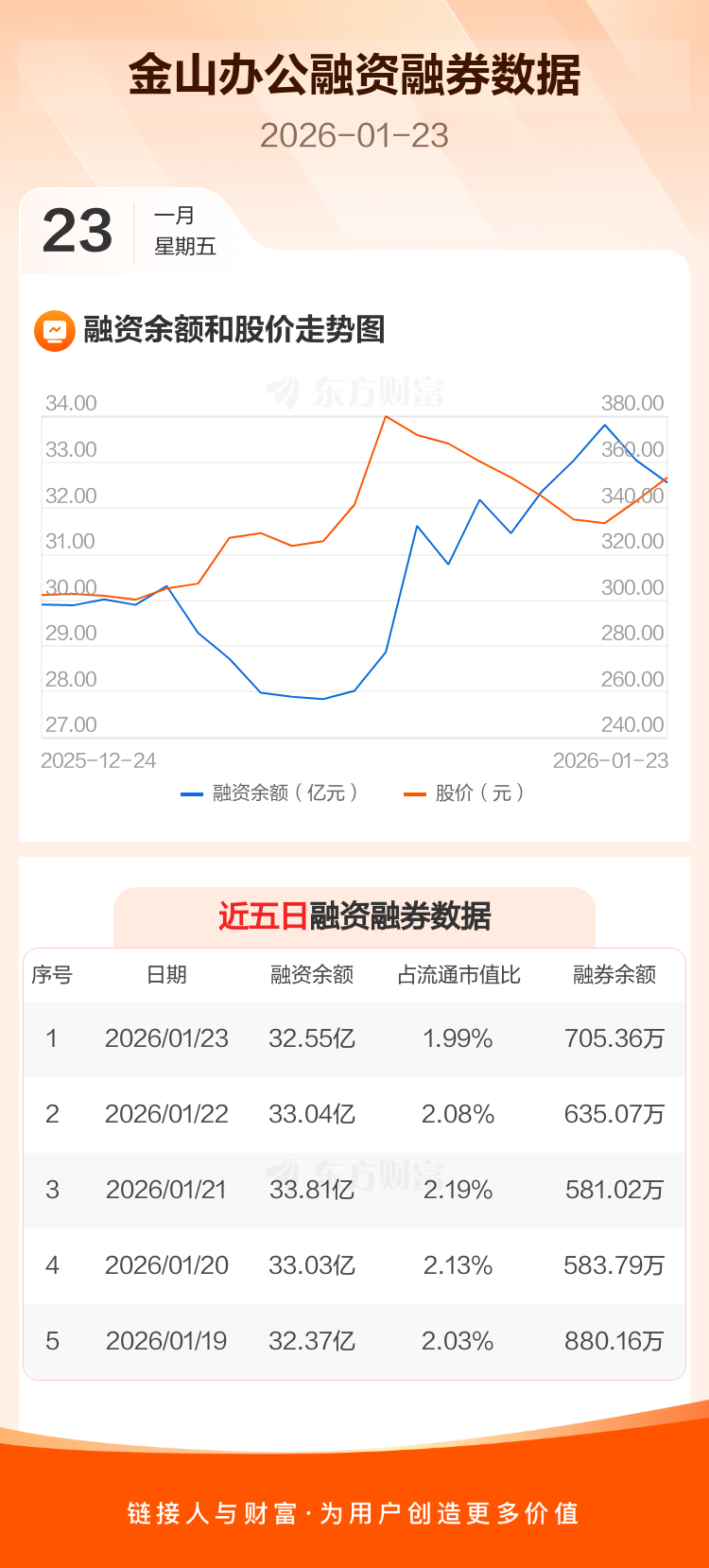交易所最新数据显示,金山办公于2026年1月23日获融资买入2.97亿元,融资偿还3.46亿元,当日融资净偿还4889.92万元。目前,该股融资余额32.55亿,占流通市值比例为1.99%。