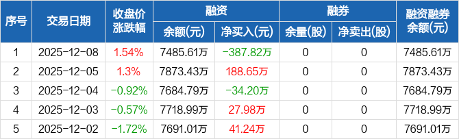 联测科技:融资净偿还387.82万元,融资余额7485.61万元(12-08)