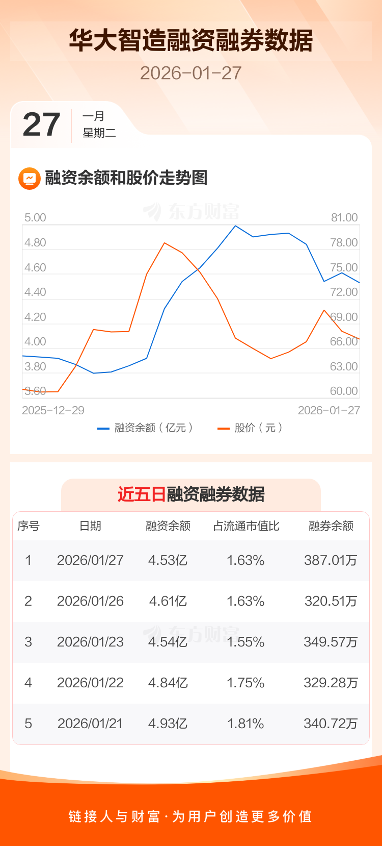 交易所最新数据显示,华大智造于2026年1月27日获融资买入2598.96万元,融资偿还3372.31万元,当日融资净偿还773.35万元。目前,该股融资余额4.53亿,占流通市值比例为1.63%。
