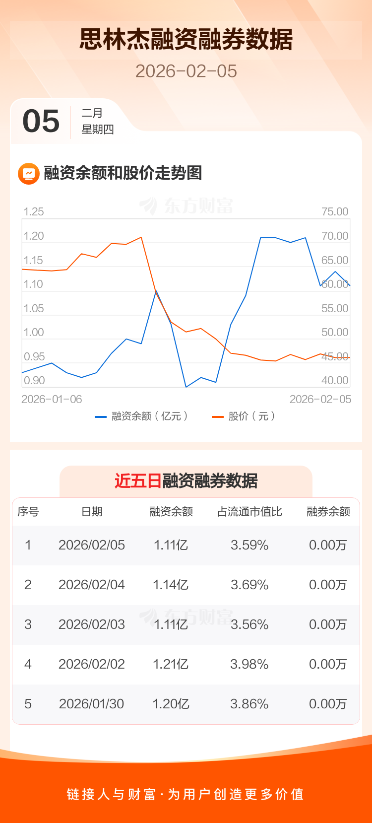 交易所最新数据显示,思林杰于2026年2月5日获融资买入199.10万元,融资偿还495.79万元,当日融资净偿还296.68万元。目前,该股融资余额1.11亿,占流通市值比例为3.59%。