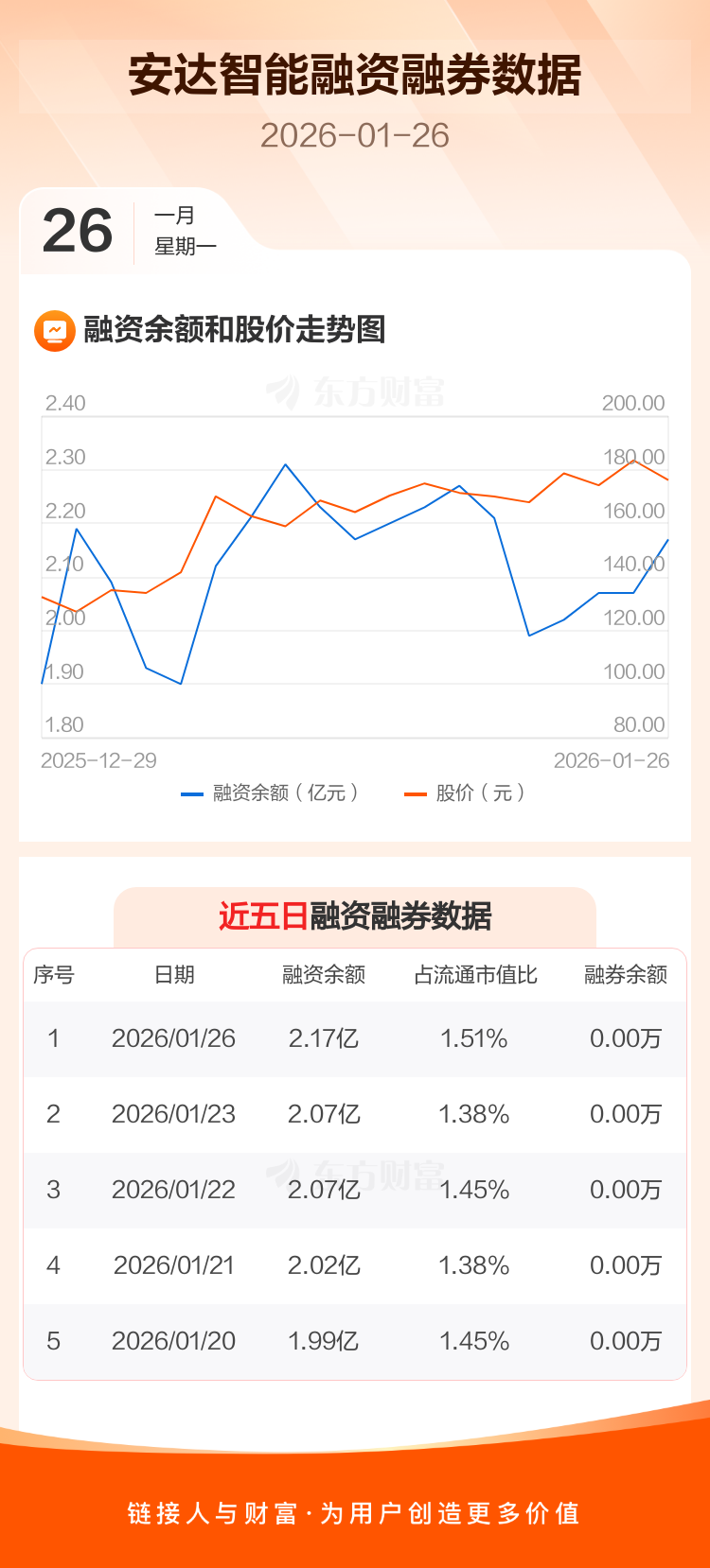 交易所最新数据显示,安达智能于2026年1月26日获融资买入2884.77万元,融资偿还1889.32万元,当日融资净买入995.45万元。目前,该股融资余额2.17亿,占流通市值比例为1.51%。