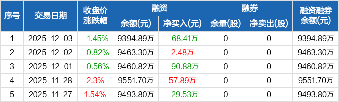 邦彦技术:融资净偿还68.41万元,融资余额9394.89万元(12-03)
