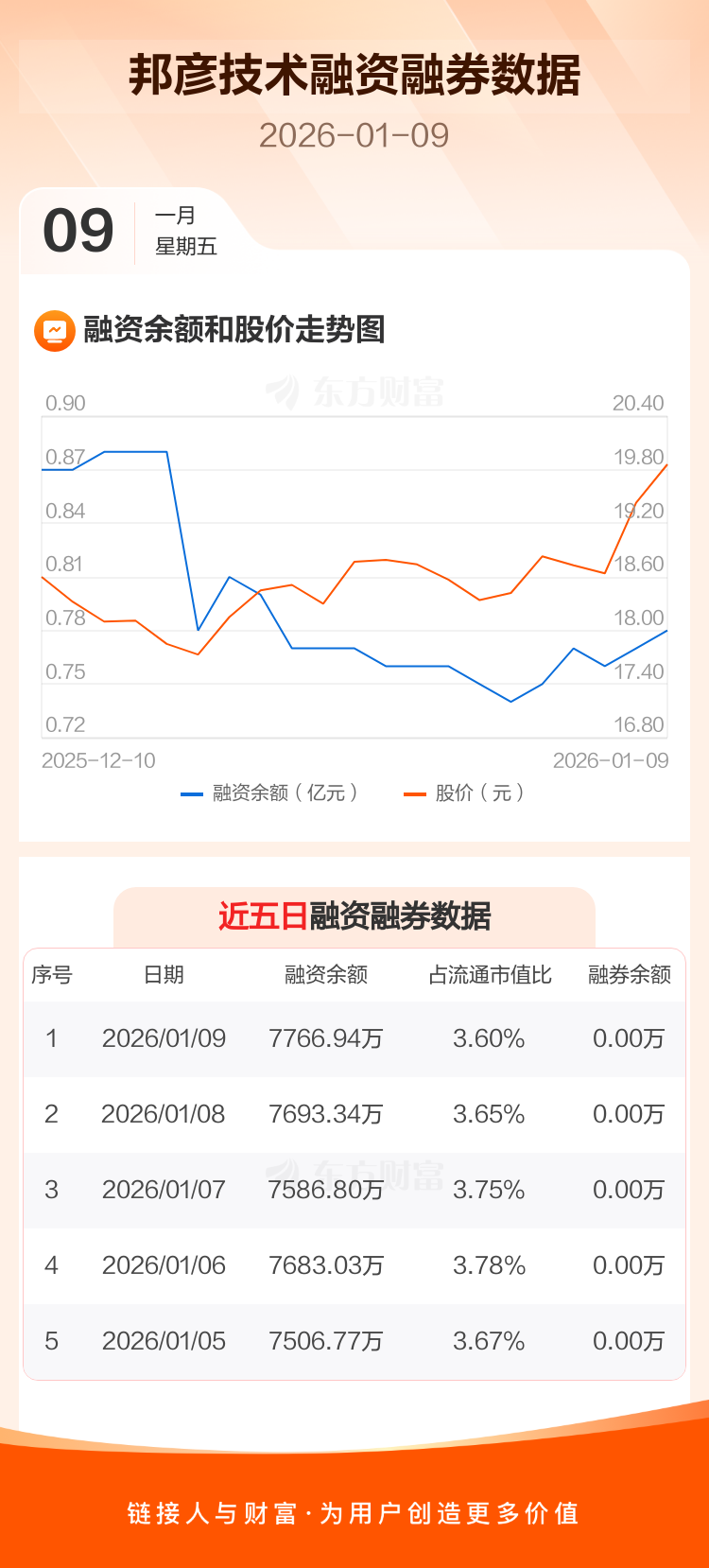 交易所最新数据显示,邦彦技术于2026年1月9日获融资买入635.40万元,融资偿还561.80万元,当日融资净买入73.6万元。目前,该股融资余额7766.94万,占流通市值比例为3.60%。