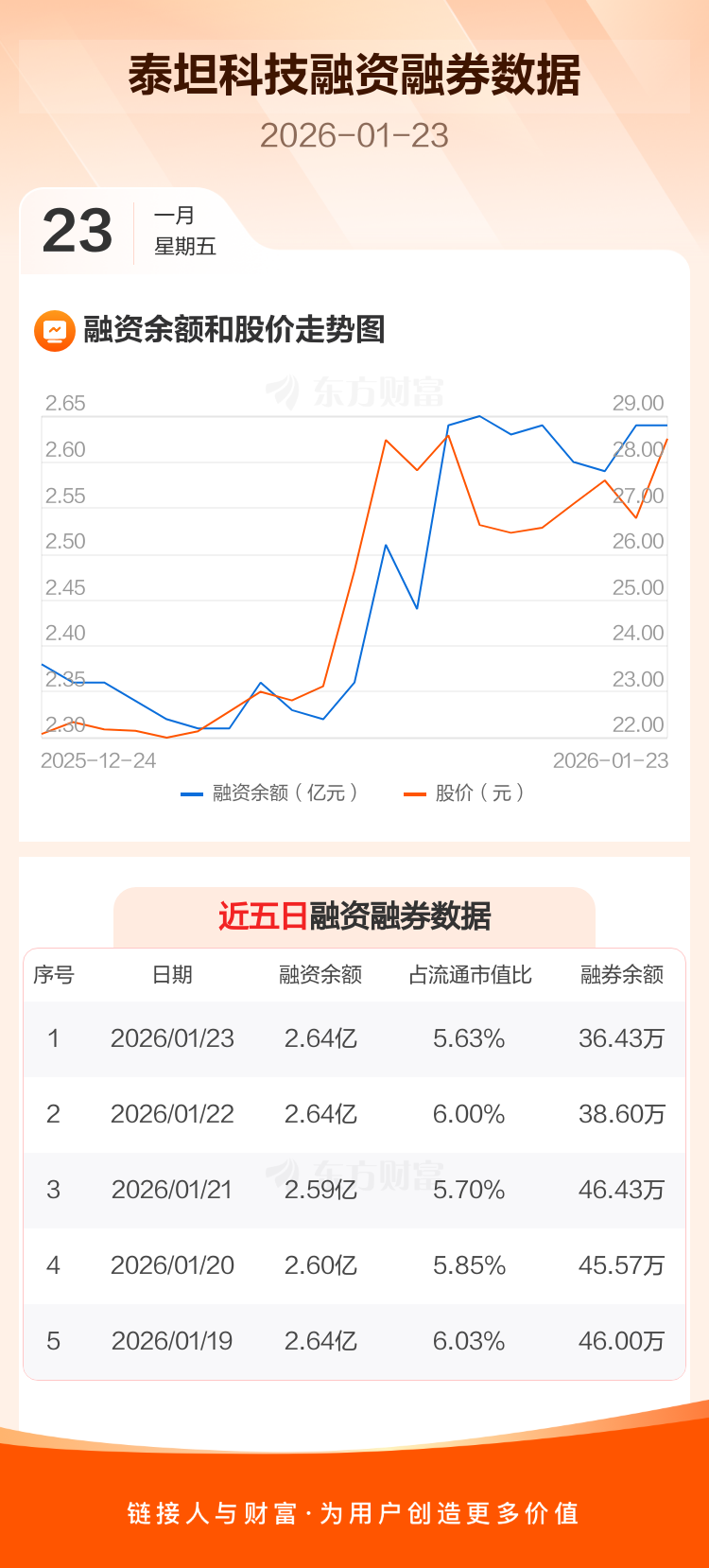 交易所最新数据显示,泰坦科技于2026年1月23日获融资买入2901.08万元,融资偿还2928.43万元,当日融资净偿还27.34万元。目前,该股融资余额2.64亿,占流通市值比例为5.63%。