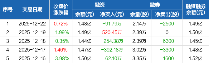 唯捷创芯:融资净偿还91.79万元,融资余额1.48亿元(12-22)