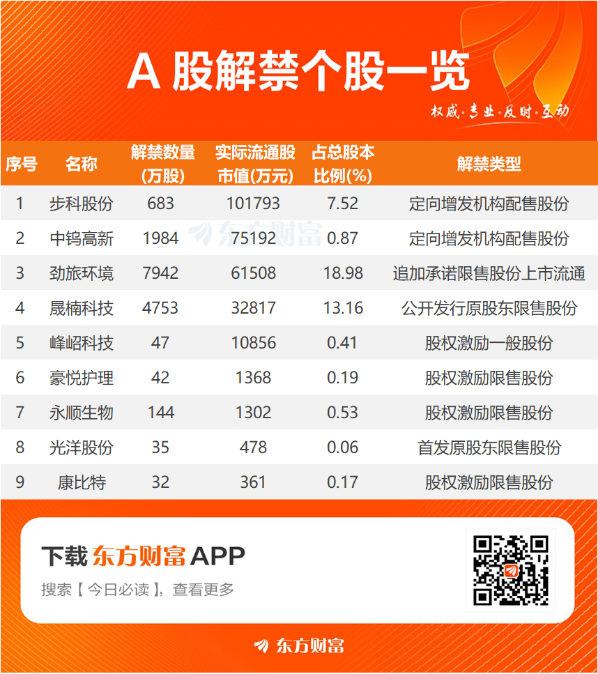 【明日解禁】明日9股解禁 步科股份、中钨高新解禁市值居前