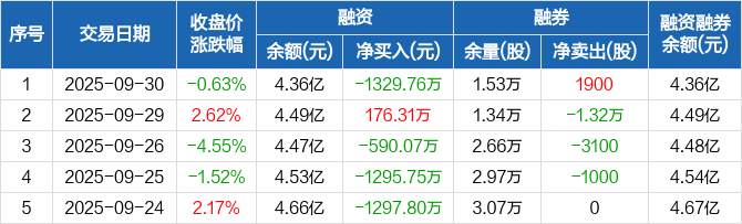 埃夫特:融资净偿还1329.76万元,融资余额4.36亿元(09-30)