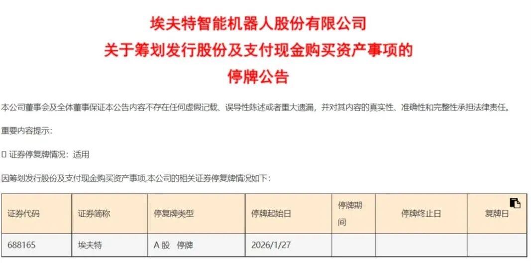1月27日,埃夫特(688165)发布公告称,公司正在筹划以发行股份及支付现金的方式购买盛普股份股权。公司已与交易意向方签署了《股份收购意向协议》,约定公司拟通过发行股份及支付现金的方式取得交易标的控制权。本次交易预计不构成重大资产重组,亦不构成关联交易。公司股票自1月27日起停牌,预计不超过10个交易日。
