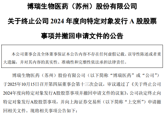 “公司决定终止本次向特定对象发行股票事项并撤回申请文件,不会对公司正常生产经营造成重大不利影响。”博瑞医药指出。