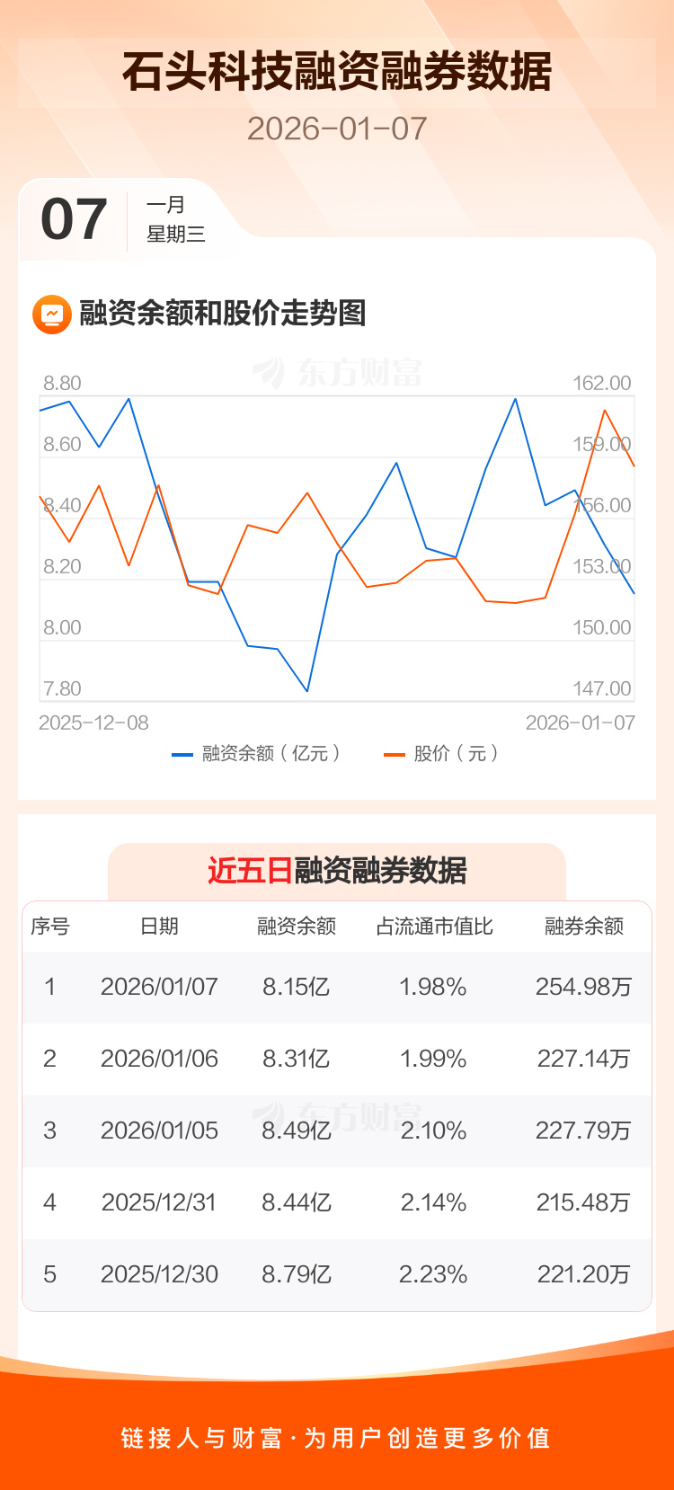 交易所最新数据显示,石头科技于2026年1月7日获融资买入8210.02万元,融资偿还9797.79万元,当日融资净偿还1587.77万元。目前,该股融资余额8.15亿,占流通市值比例为1.98%。