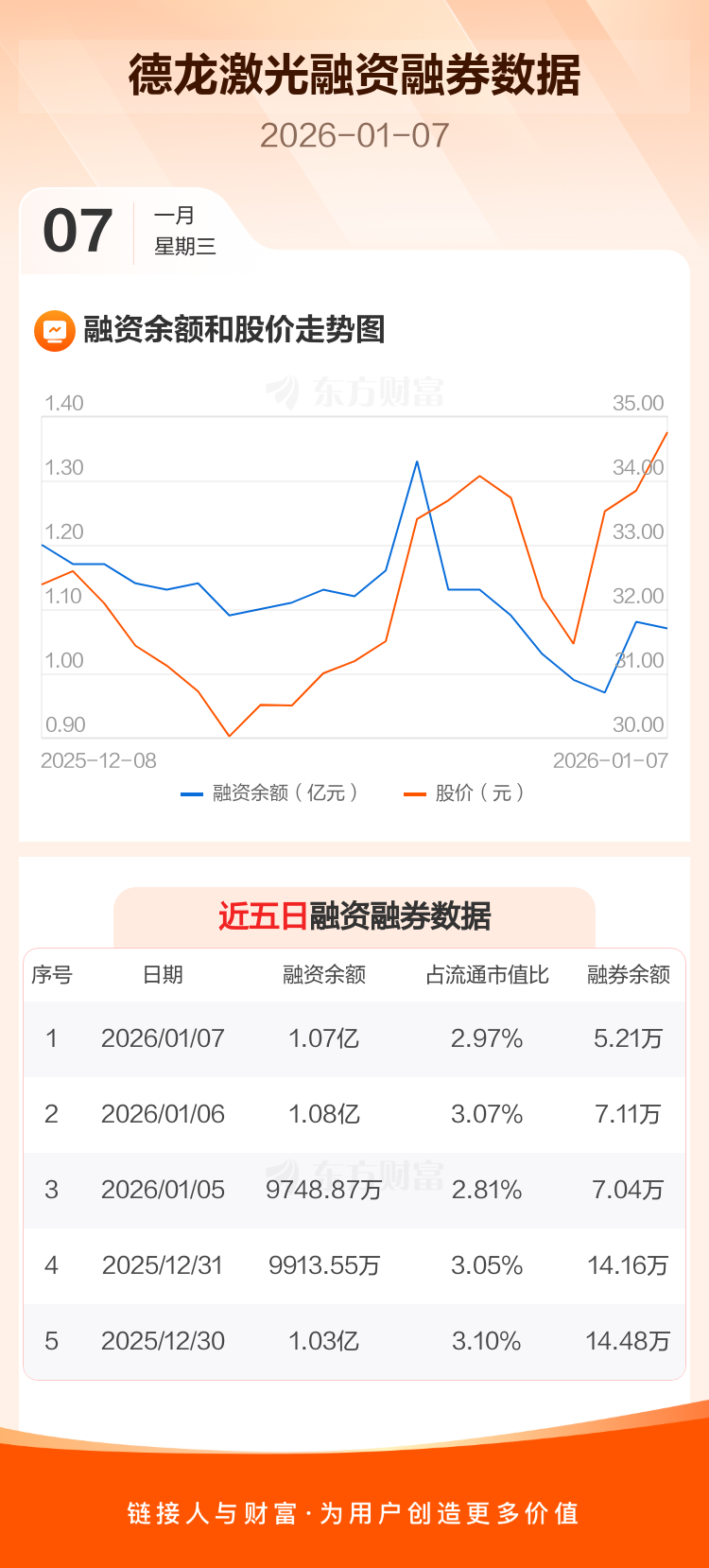 交易所最新数据显示,德龙激光于2026年1月7日获融资买入1541.39万元,融资偿还1642.17万元,当日融资净偿还100.78万元。目前,该股融资余额1.07亿,占流通市值比例为2.97%。