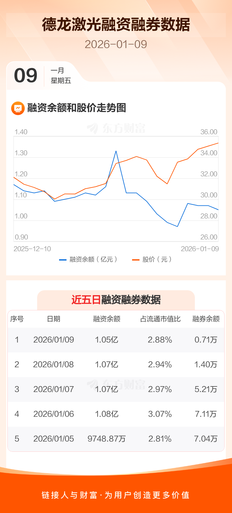 交易所最新数据显示,德龙激光于2026年1月9日获融资买入1337.35万元,融资偿还1484.22万元,当日融资净偿还146.87万元。目前,该股融资余额1.05亿,占流通市值比例为2.88%。
