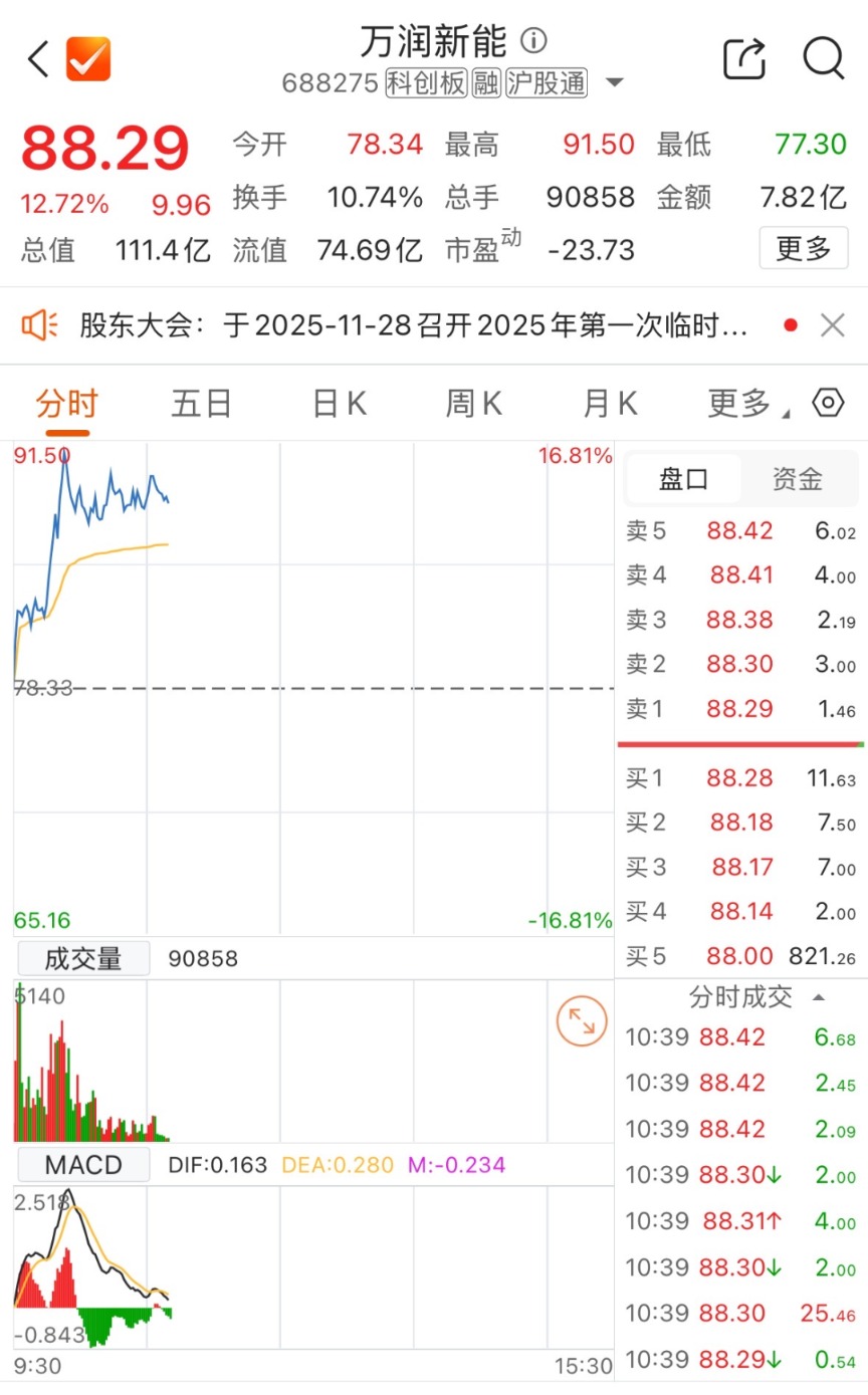 万润新能截至发稿涨12.72%,股价达88.29元/股。