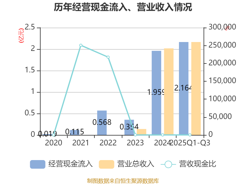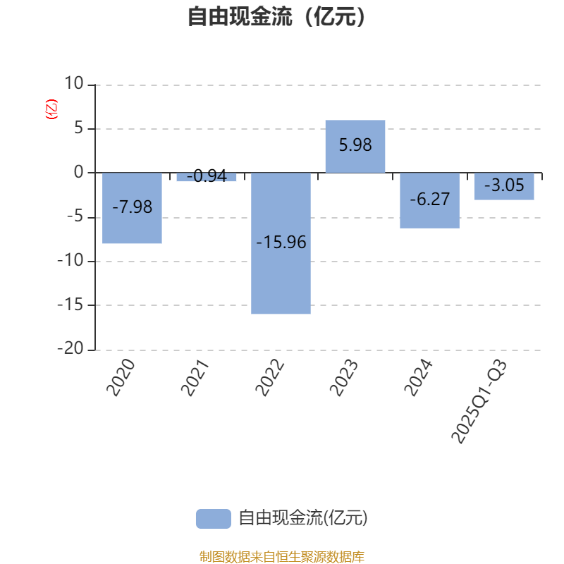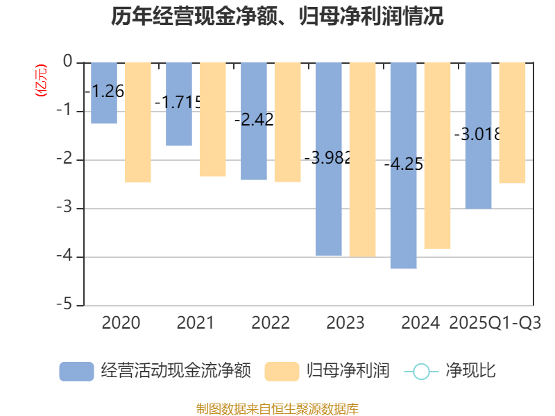 2025年前三季度,公司经营活动现金流净额为-3.02亿元,同比增加2336.08万元;筹资活动现金流净额1.81亿元,同比增加2.5亿元;投资活动现金流净额-6029.37万元,上年同期为4.44亿元。